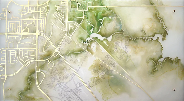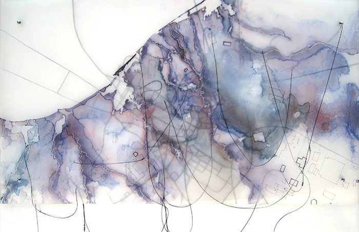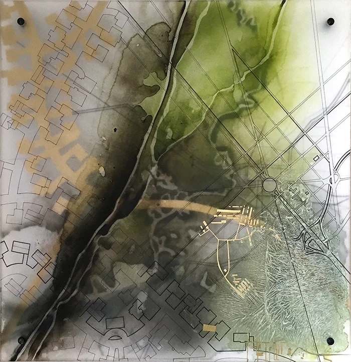 Alchemy of Memory explores recollections from long ago. Roads paved with nostalgia shimmer forth in my memory, and like alchemy those experiences are transformed into treasure. When these memory maps are layered in paint, a translucency is allowed that mimics the passing of time through locations. Like memory, certain areas are clear while others hazy; Moments and people from the past are either prominent or fade away. Aerial views of important neighborhoods and other locations are preserved, while images deep in the watercolor are less easy to decipher. This process illustrates how events from long ago, though hard to remember, still live in the subconscious and contribute to identity.